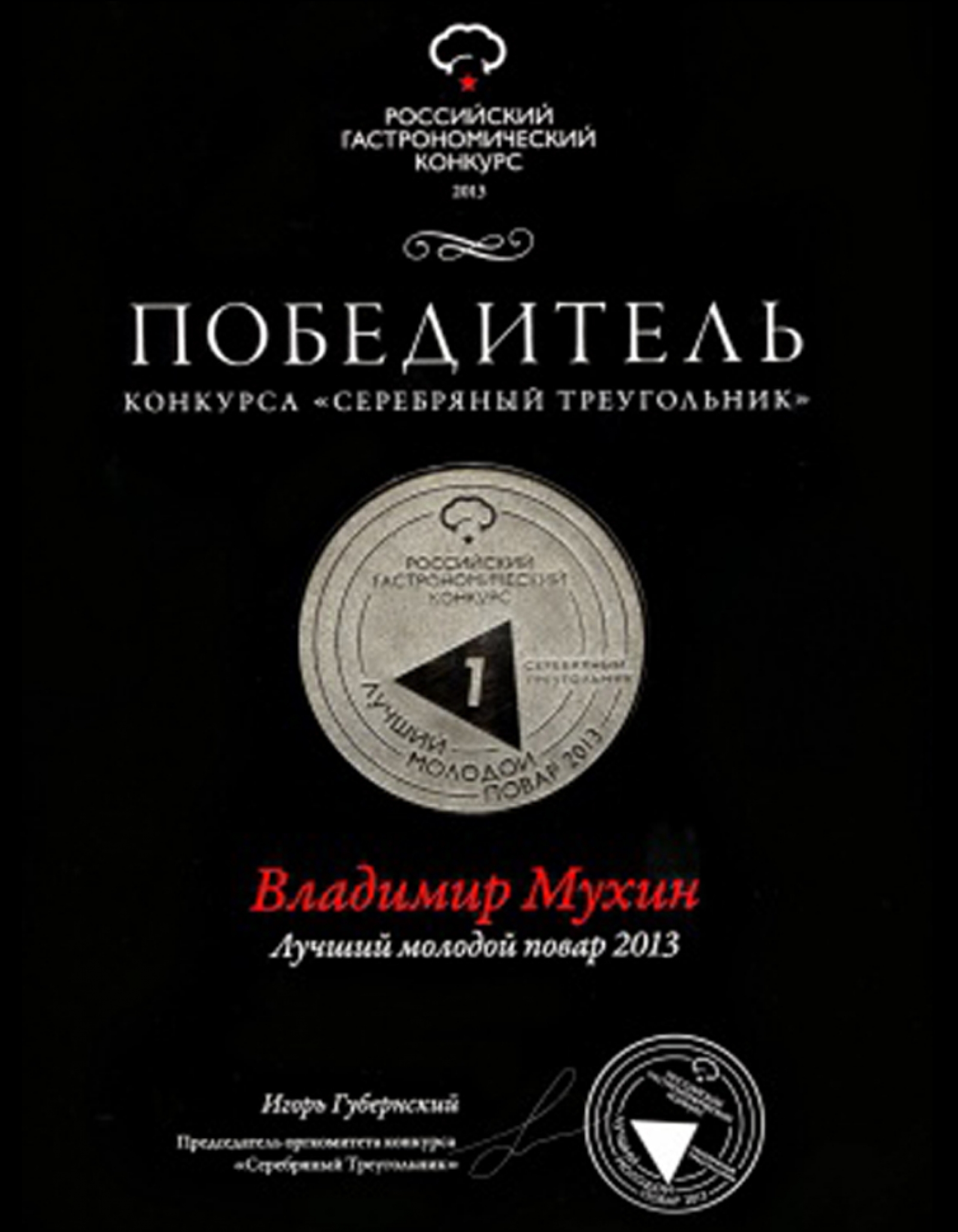 После победы на «Серебряном треугольнике» Владимир Мухин, шеф-повар White Rabbit Restaurant & Bar, отправился в Венецию защищать честь страны на конкурсе S.Pellegrino Cooking Cup. По итогам двух этапов соревнования он стал серебряным призером - никогда еще в истории конкурса Россия не занимала такого высокого места. Среди соперников Владимира были сильнейшие повара из Австралии, Китая, Бельгии, Израиля, Австрии, Голландии, Италии, Объединенных Арабских Эмиратов и США. По правилам конкурса участники должны были готовить блюда на небольшой кухне, расположенной на яхте. В их распоряжении были лишь ингредиенты, купленные ими утром того же дня на рынке Rialto. Владимир готовил жареную на сковороде мерлузу с ложной кашей из дикой спаржи, сердцевинами цветных томатов, семечками подсолнуха и костромской солью. «Я сделал выбор в пользу игры и превратил мое блюдо в пазл. Мне нравится органическая еда. Я считаю, что вкус блюда должен быть чистым от начала до конца», – прокомментировал свой выбор шеф-повар.
